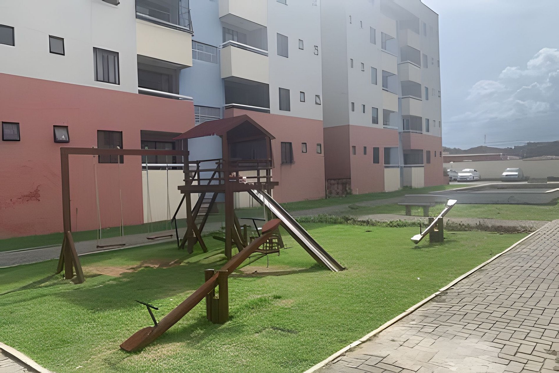 Prédio com piscina, brinquedos ao ar livre, quadra de esportes, 1 vaga de garagem e portaria 24 horas.